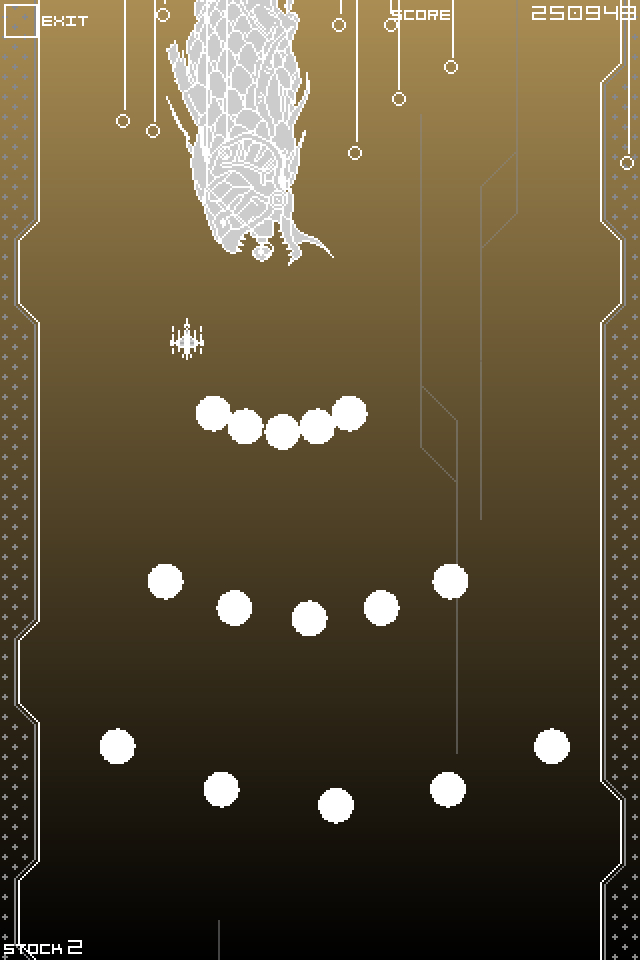 雰囲気は丸々ダライアス。曲も懐かしすぎます。ボスはキングフォスル!画面は縦画面ですが、ぜひ横画面で遊んでもらいたいですね。