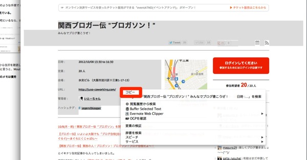 ATNDのページから住所を確認して、それを iPhone に打ち込めばいいわけなんですけども、私は手打ちコピペが嫌いなんです。で、どうするかと言うと、Moutain Lion の連携機能を使います。