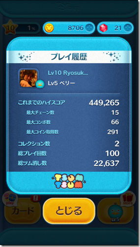 結局30回引いて、10種類のツムをゲットすることができたようです。ミッキー含めて11種類なので @3種類 というところで終了。まあ、上出来といっておきましょう。
