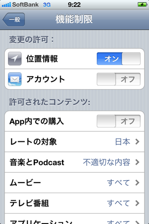 ・「アカウント」はフリーアカウントなどで自由に増やせる可能性がありますし、MobileMeの設定も変えさせたくないので、変更の許可は与えていません。