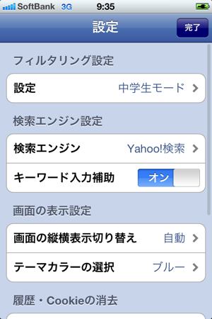 最初に挙げた3つの要素を満たすためにまず「フィルタリング」では、Safariの代わりに「Yahoo!あんしんねっと」というアプリを選択しました。それで完璧というわけではありませんが、Safariは事実上まったくフィルタリング機能は働きませんのでそちらを使わせるよりもこちらの方がまだ安心というレベルなのかもしれません。