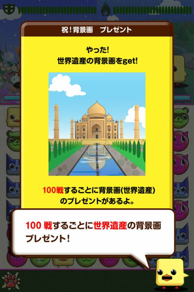 100戦するたびに「世界遺産」の背景画がもらえます。