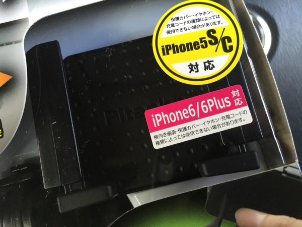 ええ、この部分ですよ。 iPhone 5 s/c 対応もシール対応です。いつの製品なんでしょうね。でも一応対応と書いてあるからホルダーにはまらないってこともないでしょうってことでまずは外観から。